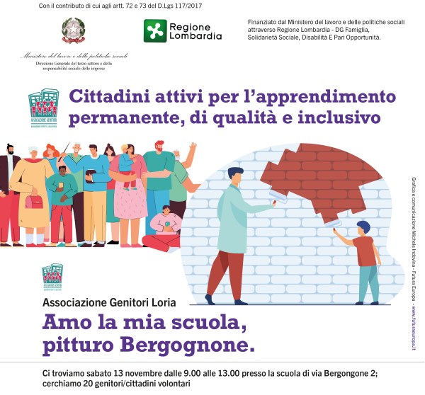 Amo la mia scuola...pitturo Bergognone!Genitori e bimbi, ci vediamo sabato 13 Novembre, dalle 9.00 alle 13.00, in Via Bergognone 2. Armati di pennelli e rulli ridipingeremo la facciata esterna e la cancellata...e con scope e palette ripuliremo il cortile!Iscrivetevi sul sito https://volontariato.comune.milano.it/eventi/amo-la-mia-scuola-pitturo-bergognone...o venite direttamente sabato mattina!